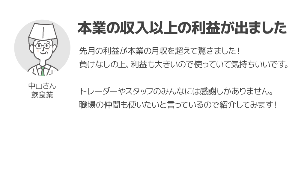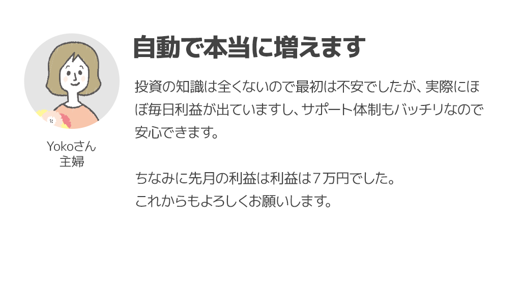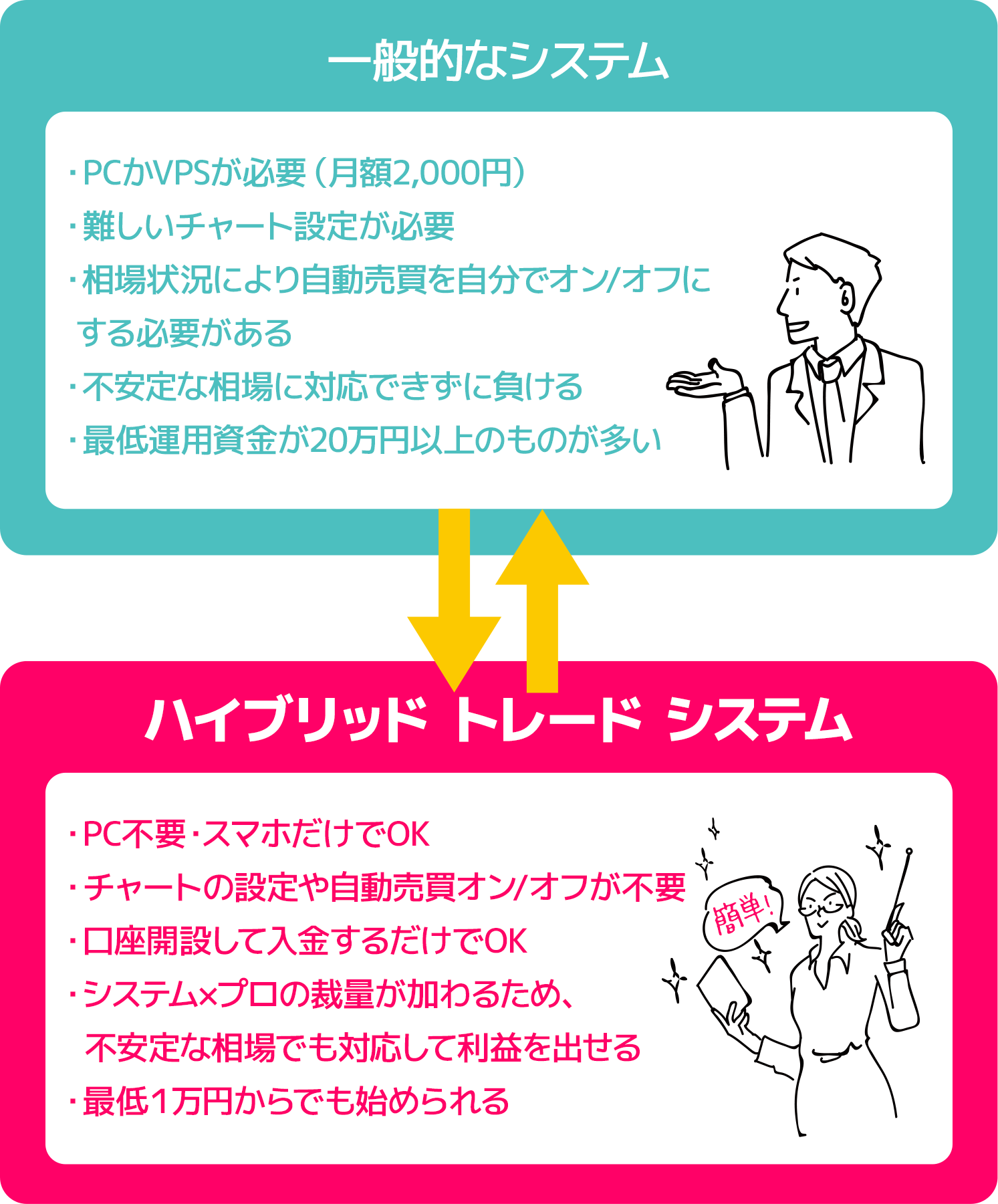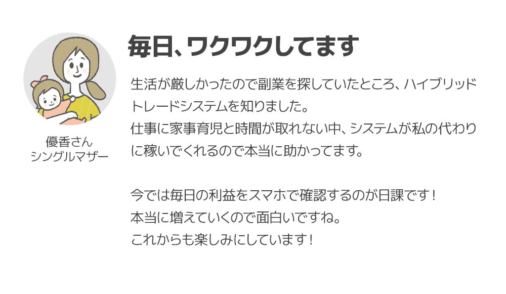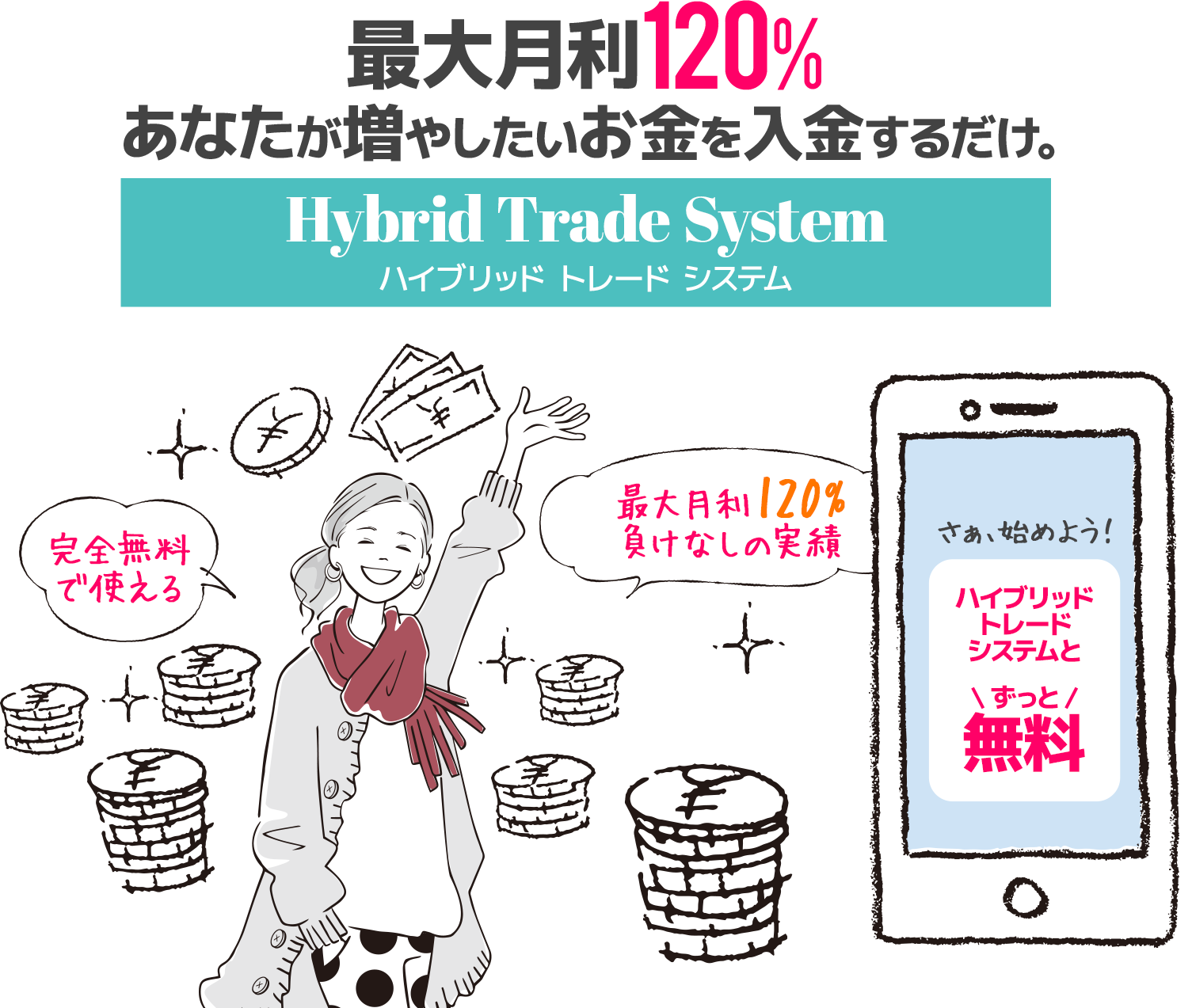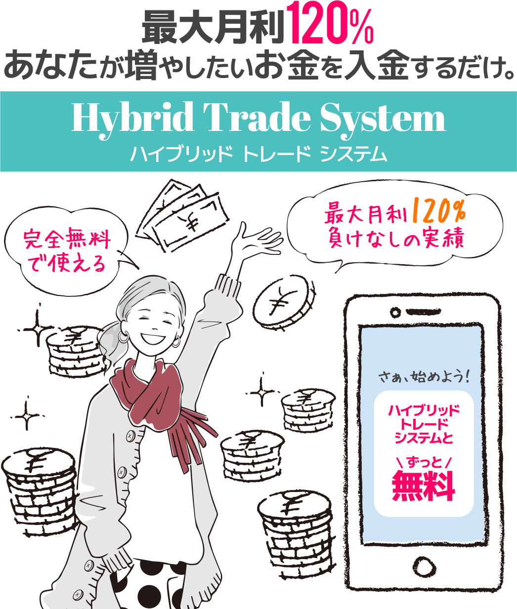 ハイブリッドトレードシステムがあなたの代わりに資産運用をしてくれます。投資の知識が無くてもお金が増えていくので、とても魅力的です。