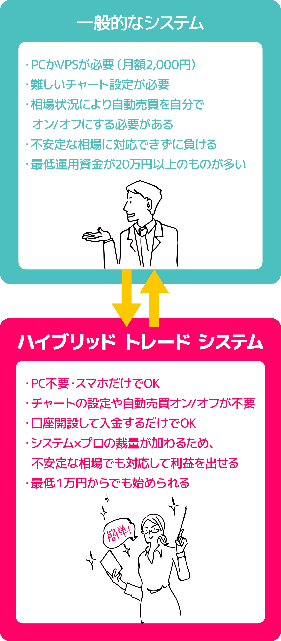 ハイブリッド トレード システムは10年以上の実績を持つプロの投資家チームが作りました。そして、プロが監視のもと動くため、相場が急変した場合でもリスクを抑えて利益を取りに行くことができています。